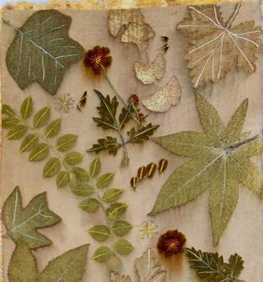 Cotton and different Silks will be treated (mordanted) with minerals to encourage a large selection of leaves to impart their unique print. The addition of tannins, iron and natural dyes will give different effects and colours to the background cloth. Samples made during the workshop will include a variety of techniques to help achieve satisfying prints.